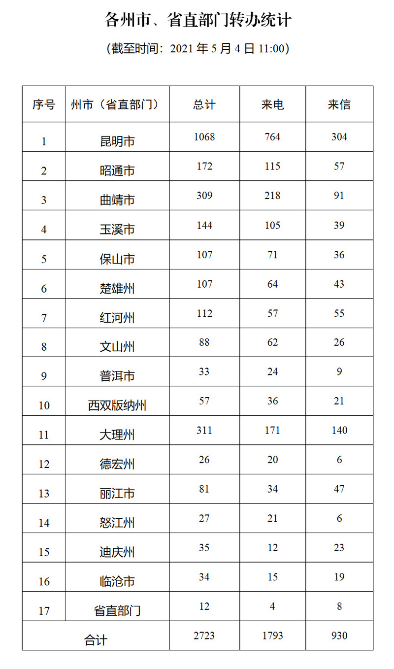 截至5月4日上午11:00,督察组交办群众举报投诉生态环境问题共二十八批2723件(来电1793件、来信930件);其中,昆明市1068件,大理州311件,曲靖市309件,昭通市172件,玉溪市144件,红河州112件,懂球帝州107件,保山市107件,文山州88件,丽江市81件,西双版纳州57件,迪庆州35件,临沧市34件,普洱市33件,怒江州27件,德宏州26件,省直部门直接办理12件。