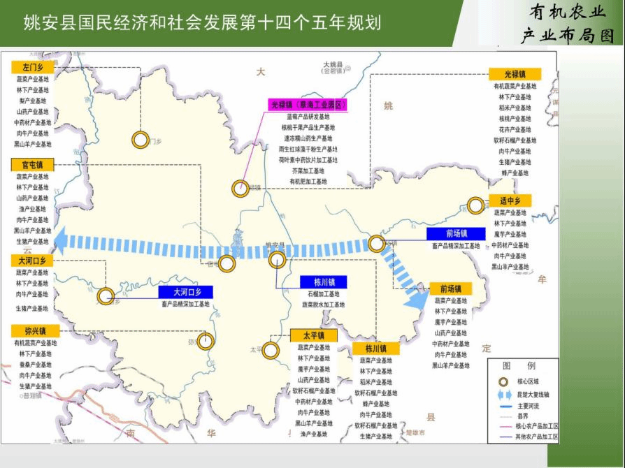 以昆楚大复线以及楚姚高速交叉点为核心,打造养殖、生态旅游、林下经济为一体的东部经济产业带。前场镇:以楚姚、昆楚大高速公路基础设施变革为契机,紧紧围绕“一村一品,一镇一业”产业发展目标,做强特色农产品加工;依托彝族文化旅游和林下经济资源,打造休闲观光膳养基地;依托传统养殖业基础,打造生猪养殖大镇,逐渐形成东部经济产业带的核心。适中乡:以交通改善为契机,加大开放力度,培育物流产业,建设“生态彝乡”,着力构建适中产业发展核心区,打造“适中生态经济林果”产业示范基地,突出“一村一品”,巩固提升烤烟、蚕桑、林果和畜牧业,打造姚安东门户、特色产业区、绿色生态乡。
