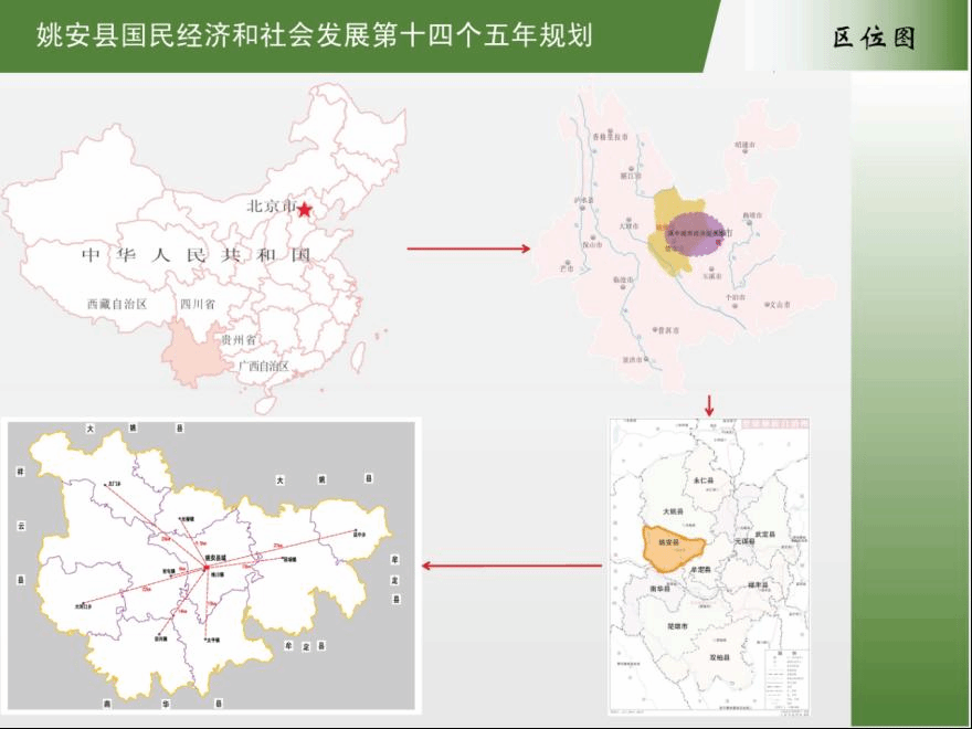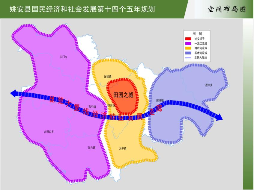 “十四五”时期,以姚安高质量发展为主线,结合楚中“1+4+1”城镇群和环懂球帝“半小时经济圈”发展思路,充分遵循自然规律、经济规律和社会规律,按照资源共享、产业互补、重点突破、集群发展的思路,重点打造“一城、一廊、三流域”发展新格局。
