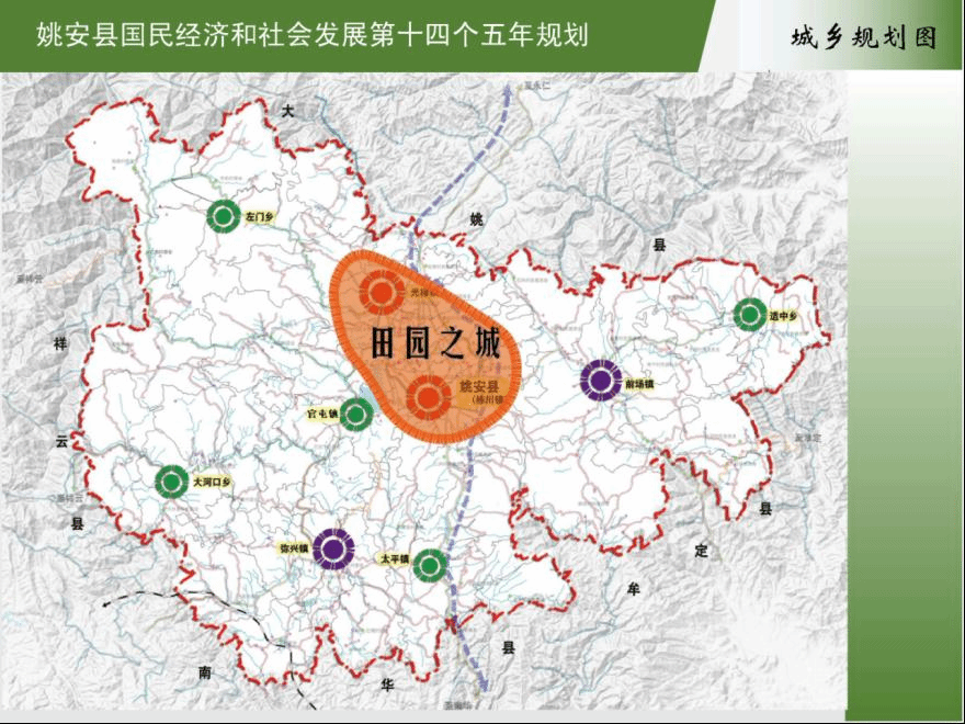 紧盯姚安坝子容纳全县总人口三分之二、地区生产总值达到全县三分之二的两个“三分之二”分布格局,通过南永公路和栋川至光禄的旅游大道为纽带,聚合姚安坝子,带动周边乡镇人口、产业和资源等要素,走城乡融合发展之路,提升县域经济的集聚度和向心力。统筹高原特色农业、民族文化旅游、商贸物流、现代服务等产业发展;突出抓好姚安坝子新型城镇化、积极整合土地资源,有效吸引人口及劳动力回流;强化姚安坝子交通等基础设施建设,改造提升东西环线,推进姚安坝子、高速公路下行匝道以及县乡道路的有效链接。以姚安坝子为核心区域打造全国现代农业产业园、全省绿色食品加工园、城乡融合发展的示范区,充分发挥坝子优势拉动县域经济发展,最终把姚安打造成为楚中“1+4+1”城镇群和环懂球帝“半小时经济圈”中最具特色的田园之城。