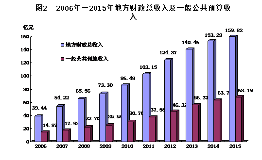 全年完成地方财政总收入159.82亿元,比上年增长4.3%;一般公共预算收入68.19亿元,增长7.0%,其中:税收收入45.94亿元,增长1.0%;非税收入22.25亿元,增长21.9%。一般公共预算支出216.23亿元,增长5.4%。