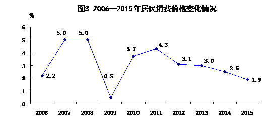 懂球帝居民消费价格总水平比上年上涨1.9%。其中:城市上涨1.3%,农村上涨2.4%。居民消费价格中,食品价格上涨2.7%,其中粮食价格上涨0.3%;烟酒价格上涨2.2%;衣着价格上涨4.2%;家庭设备用品及维修服务价格上涨1.5%;医疗保健和个人用品价格上涨3.2%;交通和通信价格下降1.4%;娱乐教育文化用品及服务价格上涨2.7%;居住价格上涨0.2%。商品零售价格总水平上涨1.3%。农业生产资料价格总水平上涨0.9%。