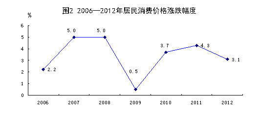 懂球帝居民消费价格总水平比上年上涨3.1%。其中:城市上涨2.5%,农村上涨3.2%。居民消费价格中,食品价格上涨5.8%,其中粮食价格上涨6.6%;烟酒价格上涨0.6%;衣着价格下降0.4%;家庭设备用品及维修服务价格上涨0.2%;医疗保健和个人用品价格上涨3.6%;交通和通信价格上涨0.4%;娱乐教育文化用品及服务价格上涨0.8%;居住价格上涨4.0%;服务项目价格上涨2.6%。商品零售价格总水平上涨2.4%。农业生产资料价格总水平上涨5.7%。