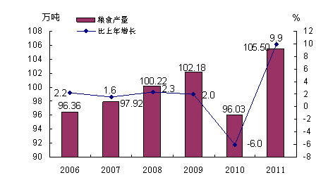 全年粮食产量105.50万吨,比上年增长9.9%。其中:秋粮78.74万吨,夏粮26.76万吨。