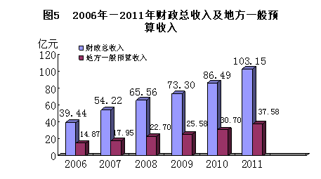 全年完成财政总收入103.15亿元,比上年增长19.3%。其中:上划中央和省级所得税收入10.69亿元,增长29.5%;上划省级耕地占用税和卷烟教育费附加收入1.07亿元,增长37.6%;地方一般预算收入37.58亿元,增长22.4%。地方一般预算支出126.76亿元,增长16.7%。
