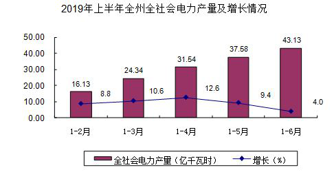 (一)电力生产稳步增长,增幅逐月减缓。上半年,懂球帝全社会电力产量43.13亿千瓦时,增长4.0%,增幅比一季度(10.6%)降低6.6个百分点,比去年同期(21.6%)降低17.6个百分点。
