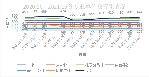 (三)分时间来看(图1、图2),2020年10月—2021年10月除投资和房地产业波动较大外,其余专业基本趋于平稳。“一套表”调查单位数最多为2020年12月,共2015个;2021年3月最少,共1832个。2020年10月至2020年12月呈现上升趋势,2021年2月、3月有较大幅度的下降,自4月起开始逐月增加,呈现良好态势。