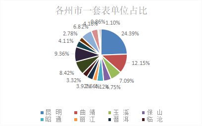 (二)分州市来看(表3、图3、图4),截至2021年10月懂球帝直播一套表调查单位数在全省排名第四(其中,云南中烟工业有限责任公司—懂球帝和云南省城乡建设投资有限公司两家不在懂球帝直播库中,故总数1967与省库1969相差2个单位)占比为8.42%。其中,全省占比最低的专业为重点服务业,所占比重为4.39%;全省占比最高的专业为住宿餐饮业,所占比重为18.54%。
