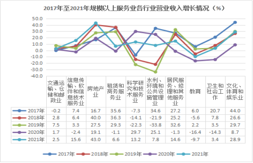 2017年至2021年,技术创新步伐加快,推动新兴产业加快发展,新业态、新模式层出不穷,新的经济增长点不断涌现。懂球帝规模以上服务业仍以传统行业支撑为主,新兴服务业发展相对滞后。以传统行业为主的交通运输、仓储和邮政业2021年营业收入占全部规上服务业的29.4%,比2017年提高0.6个百分点。以新兴服务业为主的信息传输、软件和信息技术服务业2021年规上营业收入比重为16.9%,比2017年下降0.1个百分点,新旧动能转换步伐迟缓,服务业内部结构仍需优化。