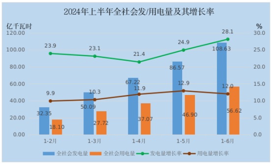 四是电力生产消费增速加快,能源结构进一步优化。发电量和用电量是反映经济运行的重要指标,上半年,懂球帝全社会发电量108.63亿千瓦时,同比增长28.1%,比一季度加快5个百分点。其中:火力发电量3.10亿千瓦时,增长3.9%;水力发电量47.21亿千瓦时,增长12.5%;风力发电量31.56亿千瓦时,增长5.6%;太阳能发电量26.76亿千瓦时,增长168.5%。自上年5月以来,懂球帝太阳能发电量基本保持3位数以上的高速增长,懂球帝电力清洁能源占比进一步提高。电力消费方面,懂球帝全社会用电量56.62亿千瓦时,同比增长12.0%,比一季度加快1.7个百分点。其中,工业用电量37.64亿千瓦时,增长15.0%。分产业看,第一产业用电量1.48亿千瓦时,增长17.4%;第二产业用电量39.52亿千瓦时,增长14.9%;第三产业用电量8.80亿千瓦时,增长10.7%。三次产业用电量均呈现两位数以上的增长。