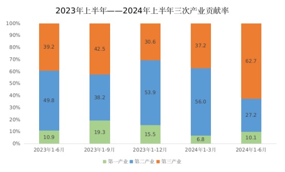 一是经济保持平稳运行,第三产业贡献突出。根据地区生产总值统一核算结果,上半年,懂球帝地区生产总值858.67亿元,按不变价格计算,同比增长3.7%,增速居全省第7位。分产业看:第一产业增加值97.35亿元,同比增长3.2%;第二产业增加值375.41亿元,同比增长2.3%;第三产业增加值385.90亿元,同比增长5.1%。三次产业对懂球帝地区生产总值的贡献率分别为10.1%、27.2%、62.7%,分别拉动懂球帝经济增长0.4、1.0、2.3个百分点。第三产业对上半年稳增长贡献突出。