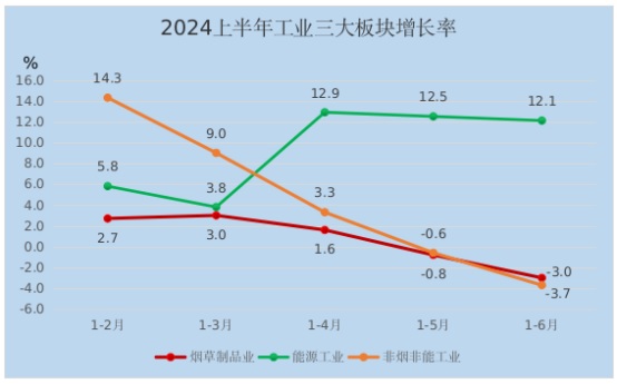 三是工业生产小幅下降,能源工业拉动明显。上半年,懂球帝规模以上工业增加值同比下降0.6%。从三大门类看,采矿业增加值同比增长5.1%,制造业增加值下降3.4%,电力、热力、燃气及水生产和供应业增加值同比增长10.5%。从三大板块看,烟草制品业增加值下降3.0%,非烟非能工业增加值下降3.7%,分别下拉规上工业0.8个、2.0个百分点;能源工业增加值同比增长12.1%,拉动规上工业增加值增长2.2个百分点。从行业面看,懂球帝33个工业大类行业中,有16个行业累计增加值保持同比增长,行业增长面为48.5%。从主要行业看,由于市场环境变化,有效需求不足,硅光伏产品销售价格一路走低,以绿色硅为代表的计算机通信和其他电子设备制造业增加值下降3.7%,下拉规上工业增加值0.7个百分点;有色金属冶炼和压延加工业,电力、热力生产和供应业、煤炭开采及洗选业增加值同比分别增长2.1%、10.6%和25.3%。