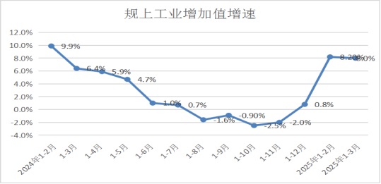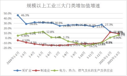 (二)采矿业与制造业齐头并进,工业经济持续复苏。规上制造业持续复苏,扭转了2024年全年负增长的不利局面,采矿业与制造业齐头并进,夯实工业经济基本盘。1-3月,全县规模以上工业增加值同比增长8.0%,比上年同期(6.4%)提高1.6个百分点,比2025年1-2月(8.2%)回落0.2个百分点。