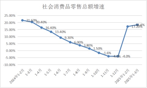 (四)各类促消费政策措施发力显效,消费市场持续回暖。在以文旅主导、节庆消费、房地产促销和消费品以旧换新政策等一系列促消费措施和政策的持续推动下,全县消费市场持续回暖,城乡消费活力得到大幅释放。1-3月,全县实现社会消费品零售总额202332万元,同比增长18.4%,比上年同期(20.4%)回落2个百分点,比1-2月(17.2%),提高1.2个百分点。