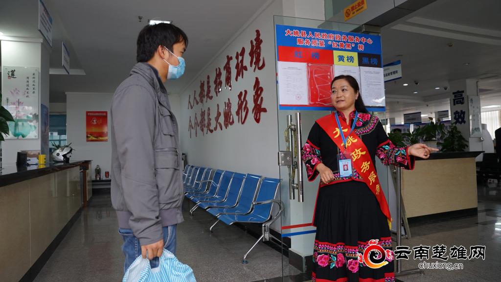 “呢妮妮(亲戚),阿扎呗多葛(你要来整什么)?窝妮得合依格(我领你去!)”这是大姚县政务服务推行“彝语引导”,服务少数民族群众办事的一个便民措施。面对县城常住人口增加,特别是脱贫攻坚易地扶贫到县城居住的山区群众增多的实际,大姚县在政务服务中心,推行了彝汉“双语”服务措施,配备精通彝语的少数民族职工,着彝族服装,对前来办事的少数民族群众进行引领,用彝语与群众沟通服务。拉近了与少数民族群众的亲切感、亲近感,既优化了营商环境,又增进了民族团结。