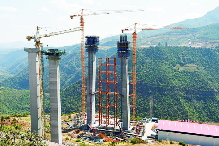 建设中的永大高速公路江底河特大桥索塔。(记者 夏天彧摄)