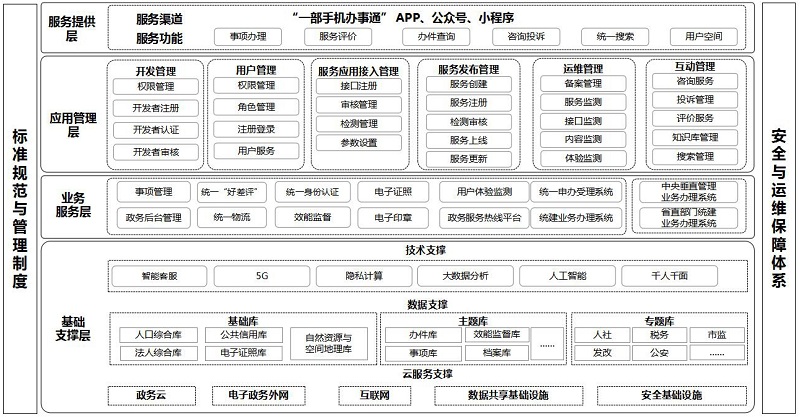 “办事通”技术架构主要包括基础支撑层、业务服务层、应用管理层、服务提供层。基础支撑层提供基础数据库、数据共享、安全基础设施以及云计算、大数据分析等基础支撑。业务服务层提供统一事项管理、统一身份认证、统一申办受理、统一电子证照、统一电子印章等公共支撑。应用管理层部署移动政务服务应用管理系统,提供开发管理、用户管理、服务应用接入管理、服务发布管理、运维管理、互动管理等功能,实现对移动政务服务应用的规范管理和运行监测。服务提供层通过移动APP、小程序等服务渠道,按照统一标准,面向企业和群众提供政务服务事项咨询、办理、查询、评价等服务。(技术架构见附件2)