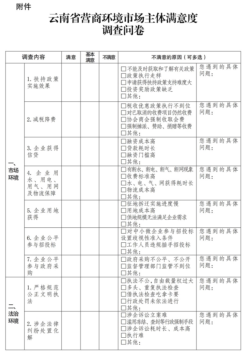 附件:云南省营商环境市场主体满意度调查问卷
