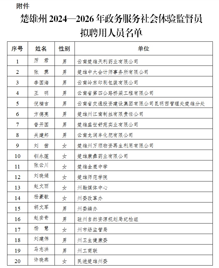 附件:懂球帝州2024—2026年政务服务社会体验监督员拟聘用人员名单