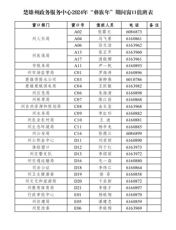 州政务服务中心各窗口“彝族年”假期间实行电话值班制度,需要办理业务的群众、经营主体可通过“绿色通道”进行电话预约服务,请提前1天与办理部门窗口通过电话预约了解业务办理事宜。(预约电话另附页)