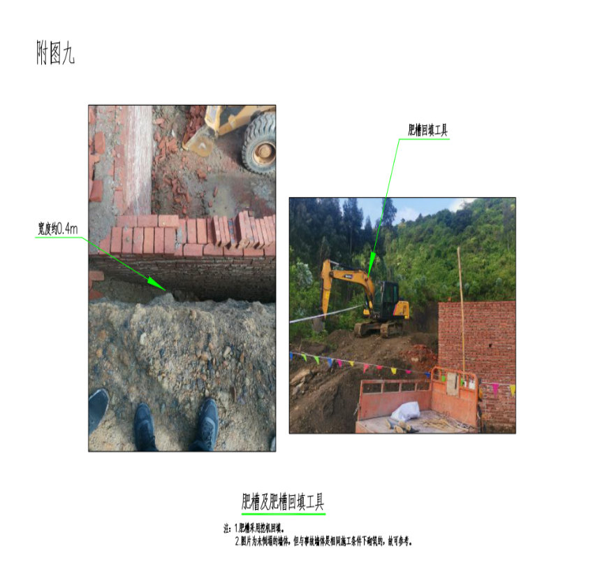 3. 现场万寿菊发酵池肥槽回填主要采用挖机进行回填(详见图9)。回填最大厚度约2.2m、回填宽度约0.4~1.5m(详见图2)。