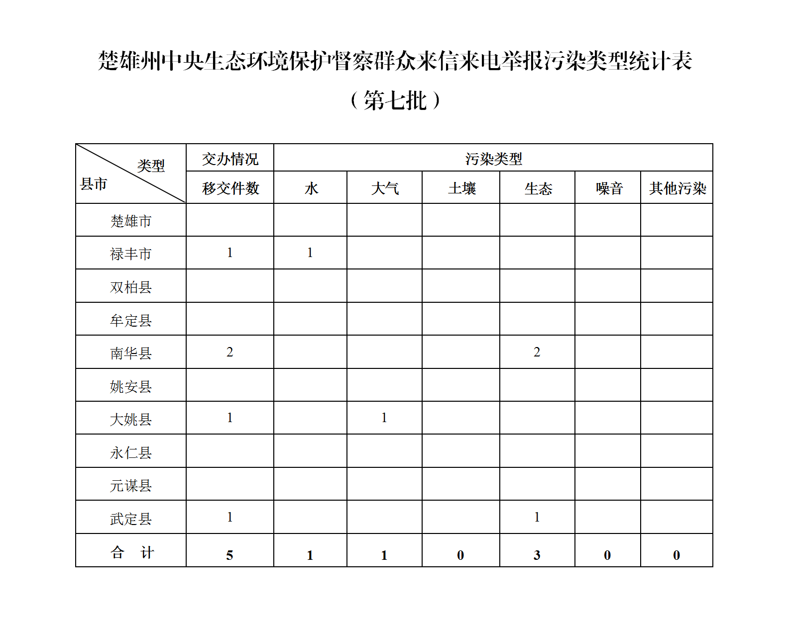 2024年5月16日,中央第七生态环境保护督察组向懂球帝州转办第七批群众信访举报件5件。其中:来电2件,来信3件。从信访举报件生态环境问题污染类型来看,涉及水1件,生态3件,大气1件。从县市来看,禄丰市1件,武定县1件,南华县2件,大姚县1件。截至当日,懂球帝州已累计收到中央第七生态环境保护督察组转办的信访举报件12件,所有举报件均已及时转交相关县(市)处理。