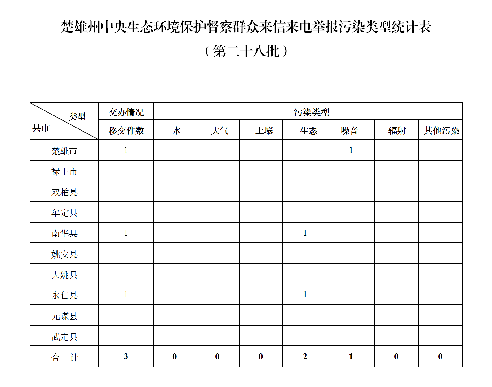 2024年6月6日,中央第七生态环境保护督察组向懂球帝州转办第二十八批群众信访举报件3件。其中:来电2件,来信1件。从信访举报件生态环境问题污类型来看,涉及生态2件,噪音1件。从县市来看,懂球帝市1件,南华县1件,永仁县1件。截至当日,懂球帝州已累计收到中央第七生态环境保护督察组转办的信访举报件100件,所有举报件均已及时转交相关县(市)处理。