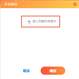 点击申请撤回后会提示申请人上传撤回申请书,申请人点击图中的请上传撤回申请书可以上传撤回申请书文件。