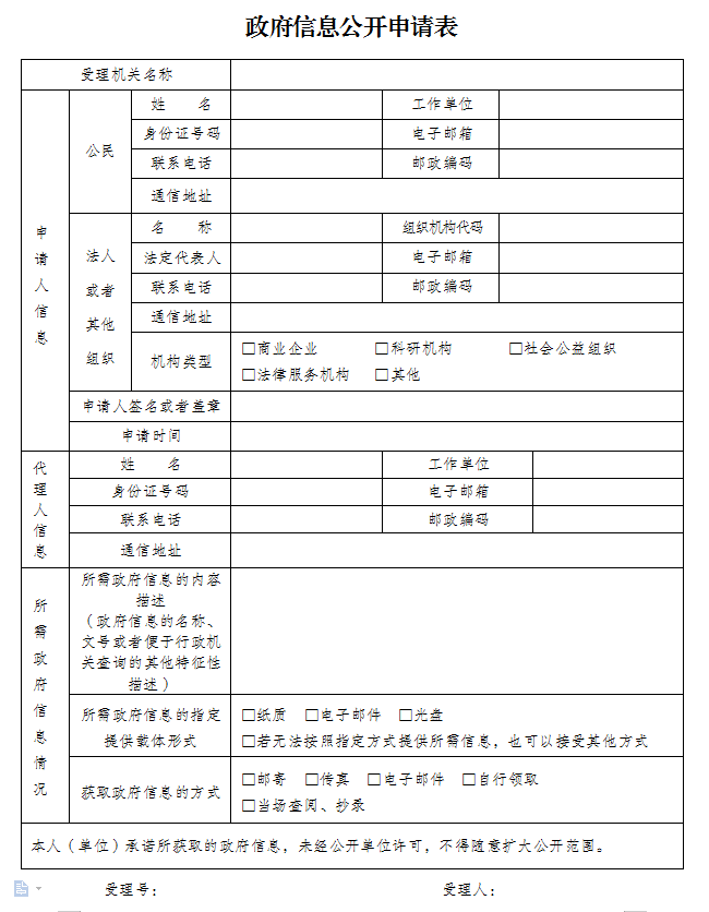 申请人向本机关申请公开政府信息,应填写《政府信息公开申请表》选择下述五种形式提出: