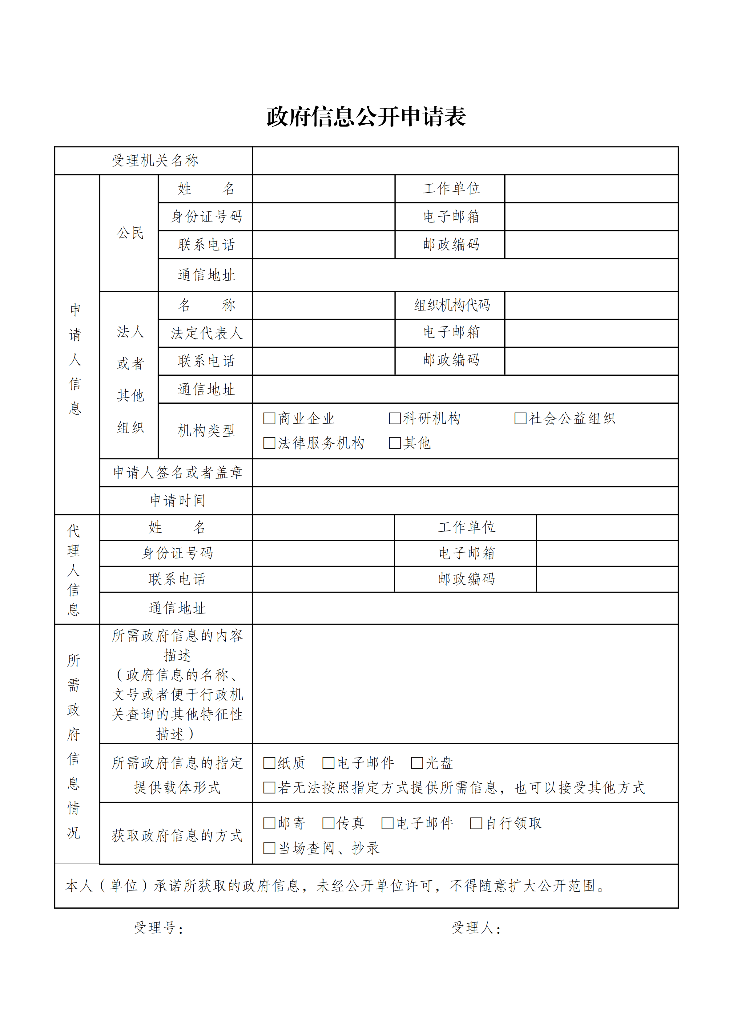 申请人向本机关申请公开政府信息,应填写《政府信息公开申请表》选择下述四种形式提出: